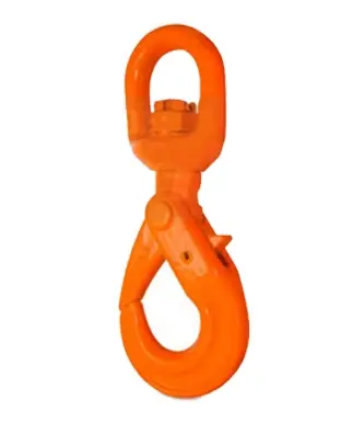 Gancho que también posee un seguro fundido, pero en este caso se requiere adicionar un conector articulado para unirlo a una eslinga de cadena.