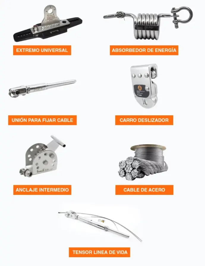 – Absorbedor de energía: Equipo diseñado para disipar la energía. Su principal misión es reducir la tensión en los extremos de la línea de vida en caso de una caída.