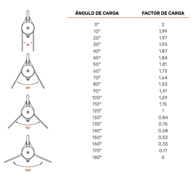 Por ejemplo, cuando las dos líneas están paralelas (Angulo 0°) y con una masa de 1.000 kilos en la línea viva, la carga resultante en el cabezal de conexión es de 2.000 kilos; y, a medida que el ángulo se incrementa, la carga disminuye.