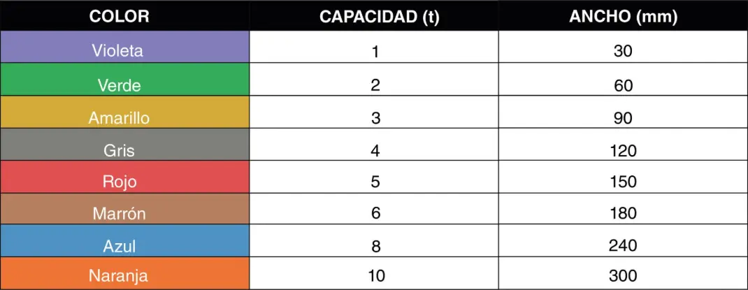 Las tolerancias en los largos que se detallan a continuación son para anchos de hasta 4”. Para eslinga de 6” y superiores, se debe añadir 2/1 más de tolerancia. Si requiere productos de dimensiones exactas debe contactarse con servicio técnico.