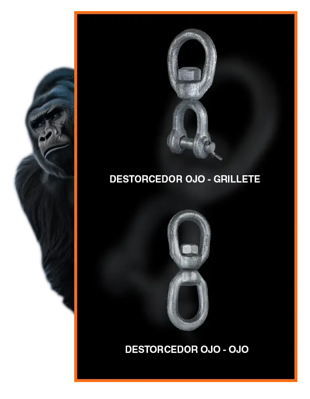 Los destorcedores GORILA tienen un factor de 5:1, cumplen normativa ASME B30.26 y FEDERAL AMERICANA RR-C-271, tipo VII, clase 1.