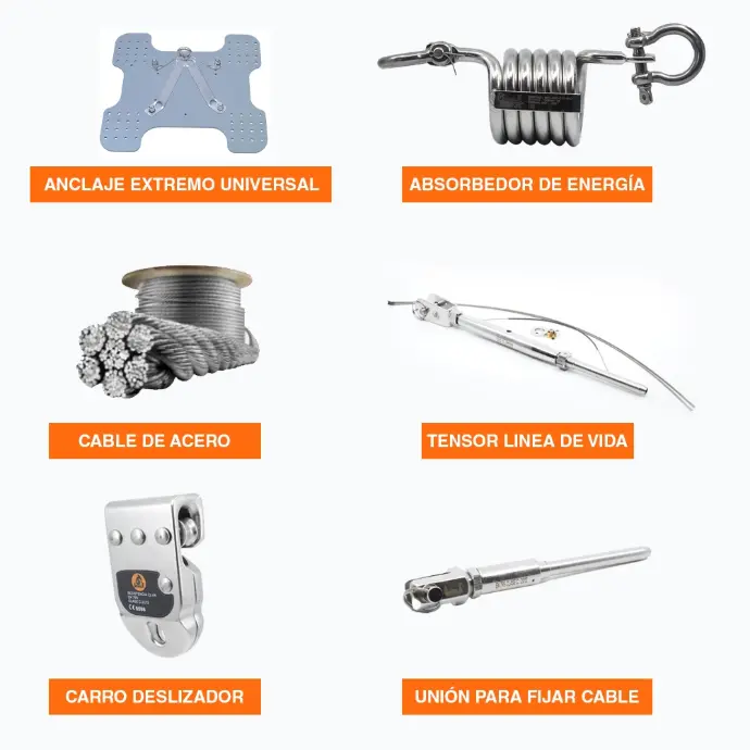 – Absorbedor de energía: Equipo diseñado para disipar la energía. Su principal misión es reducir la tensión en los extremos de la línea de vida en caso de una caída.