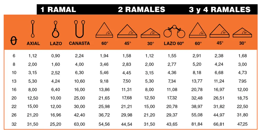 TABLA DE CARGA PARA ESLINGAS CADENAS G8
