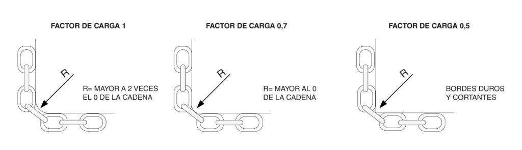 Las eslingas de cadena son fabricadas con acero grado 8 y cumpliendo con las normativas ASME B30.9 y EN 818, cumpliendo con un factor de seguridad de 4:1.