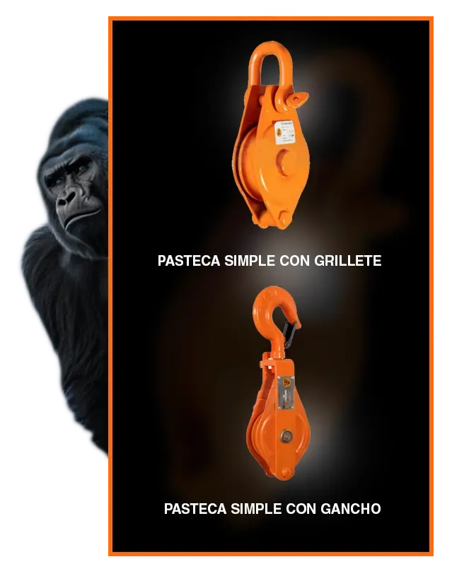 Pasteca simple con gancho: llamado así debido a que solo contiene una polea y un gancho en su toma superior.